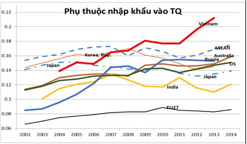 Nếu như thời điểm năm 2004, chỉ số phụ thuộc của ASEAN cao hơn của Việt Nam khoảng 16%, thì đến năm 2014, mọi việc đã đổi chiều khi chỉ số của Việt Nam cao hơn ASEAN 21,7%. Quan trọng hơn, sự việc này lại có xu hướng gia tăng nhanh chóng, đặc biệt với một số nhóm hàng như nguyên liệu dệt may, thiết bị, linh kiện điện tử, máy móc thiết bị cơ khí.